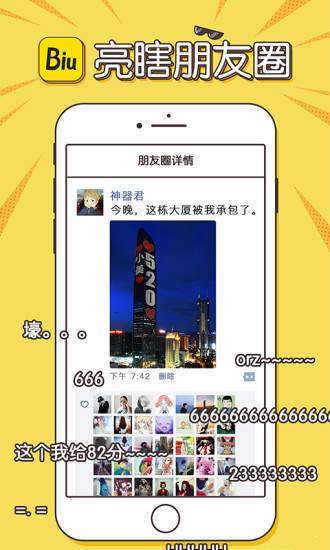 想不想让自己的朋友圈变得更加的与众不同的,那么就一定不能错过这款Biu神器app,瞬间让你的图片或者是都是表情包提高一个层次,众多的恶搞神器以及酷炫的功能,让你玩到跳不下来,而且还有各种的斗图表情,会每天为你更新,喜欢的快来下载。