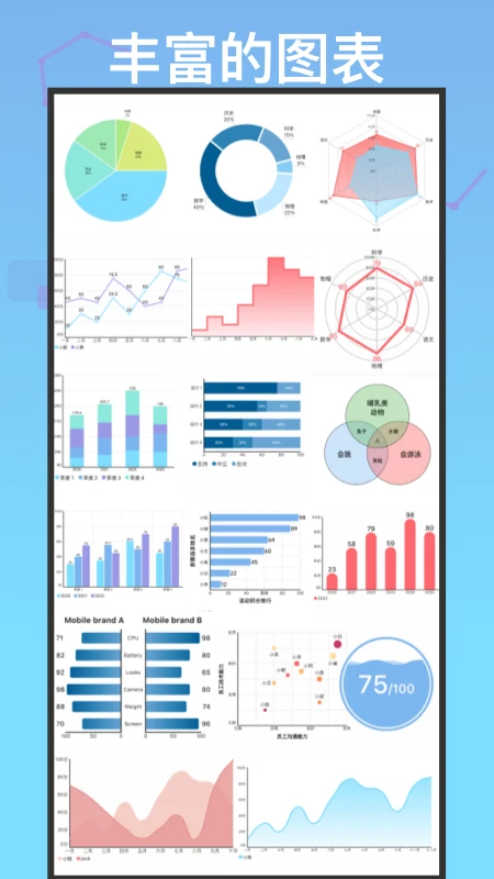1、丰富的图表种类,包括饼图、雷达图、折线图、柱状图、散点图等,满足不同场合的需求。